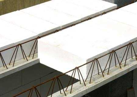 - Технологической особенностью ячеистого бетона является его относительная мягкость. Поэтому межэтажные перекрытия из железобетонных балок нельзя укладывать непосредственно на пеноблоки. Массивные плиты монтируют на армированный пояс из тяжелого бетона или силикатного кирпича.