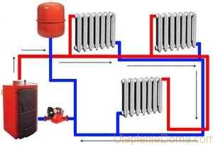 Принцип работы данной схемы не отличается сложностью. Поступивший в котел теплоноситель (вода либо антифриз) при нагреве расширяется, создавая необходимый для движения по трубопроводам и радиаторам напор.