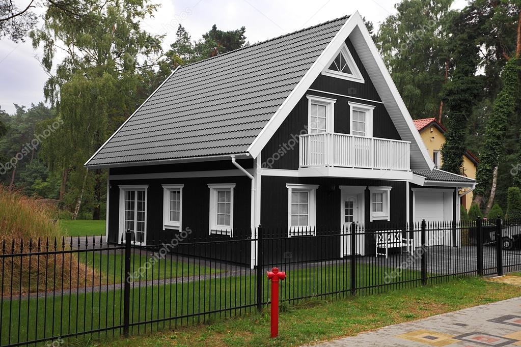 Стильный синий цвет вселяет ощущение добротности и богатства и выгодно смотрится на фоне серой кровли. Общую гармонию дополняют белые оконные рамы.