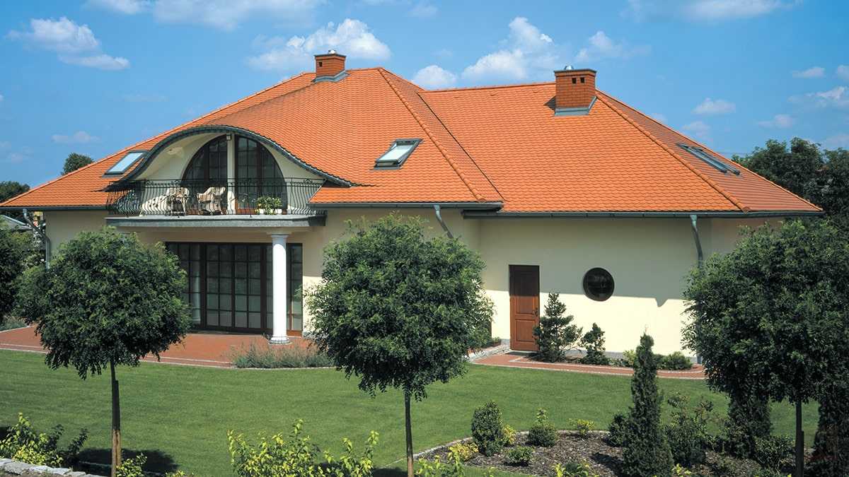Красная вальмовая крыша из Ондувиллы под натуральную черепицу удачно гармонирует с фасадами нежно-персикового оттенка.