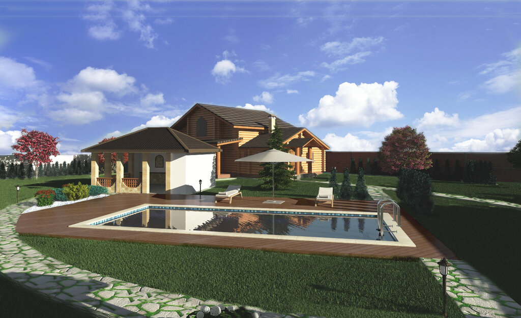 Отличный вариант с баней и огородом. Причем последний из них скрыт за декоративным прудом и детской площадкой.