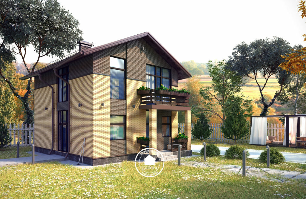 Большой двухэтажный дом из кирпича с двумя открытыми террасами с элементами стиля модерн