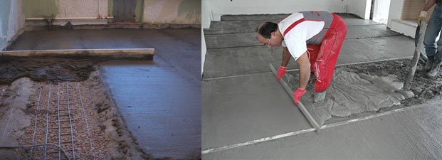 Готовую смесь заливаем полосами, выравнивая по маякам. После застывания бетона, пол утепляют и приступают к монтажу финишного слоя.