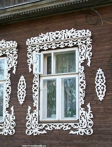 Прорезная резьба по дереву используется для украшения оконных наличников, лестничных перил, фронтонов и т.д. При изготовлении наличников из дерева прорезная резьба просто отличный вариант декора, который подчеркнет особенности дома и придаст изюминку всему дому.