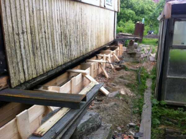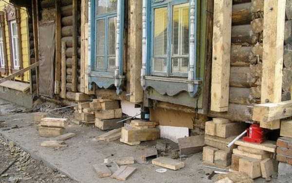 При реконструкции фундамента под деревянным домом здание следует приподнять на некоторую высоту при помощи домкратов. Если конструкция имеет признаки сильного разрушения, то лучше его полностью демонтировать и установить новый. Фундамент с незначительными изменениями можно укрепить кирпичной кладкой. Если это ленточная конструкция – установите опалубку и подлейте фундамент бетонной смесью.