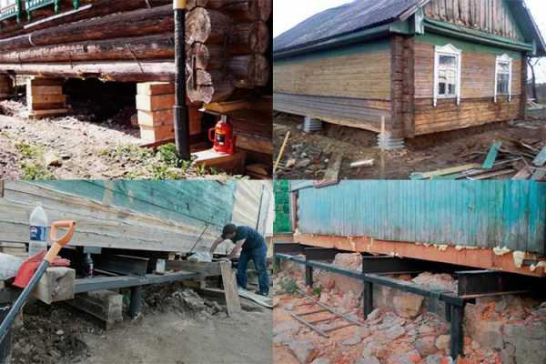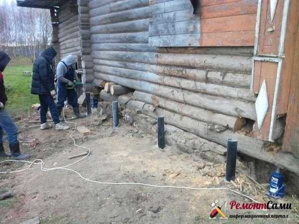 Данную процедуру не осуществить без домкратов. Этими приспособлениями, с большой осторожностью, сруб приподнимают на удобную высоту. Само основание поправляется, утепляется или заливается заново – так проводят реставрацию фундамента. Подобные манипуляции считаются достаточно опасными, поэтому для нее необходимы страховщики и наблюдатели.