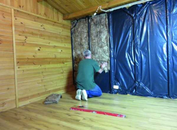 - Между брусами гвоздями крепится слой минеральной ваты и изолирующая плёнка;