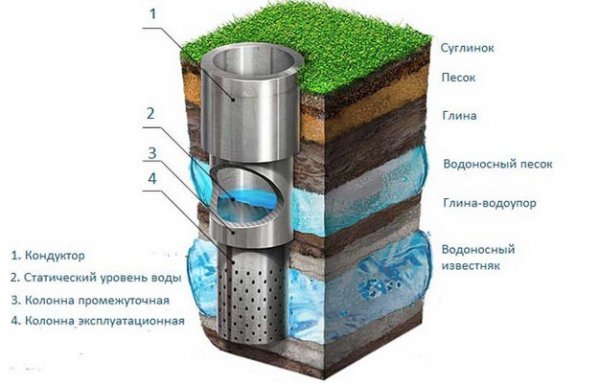 Самая глубокая из бытовых скважин и служит намного дольше всех остальных – около 80 лет, а то и больше. Но есть у неё ощутимый минус – высокая сложность и большой объём работ делают цену очень высокой. Всё дело в глубине, на которую проводятся бурильные работы. Артезианская скважина достигает глубины более 100 м, Она проходит через несколько мягких и твёрдых слоёв – суглинок, глину, водоносный песок, пока не достигнет известняка или даже более твёрдых горных пород с водоносными горизонтами.