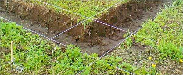 - теперь сделайте разметку. Для этого, отталкиваясь от чертежей, забейте колья по углам здания. Следует отметить, что ленточный фундамент возводится под каждую стену, повторяя контур здания. Именно это вам нужно сделать на земле. По этой разметке вы будете рыть траншею, поэтому все нужно делать ровно, соблюдая размеры и ширину фундамента;
