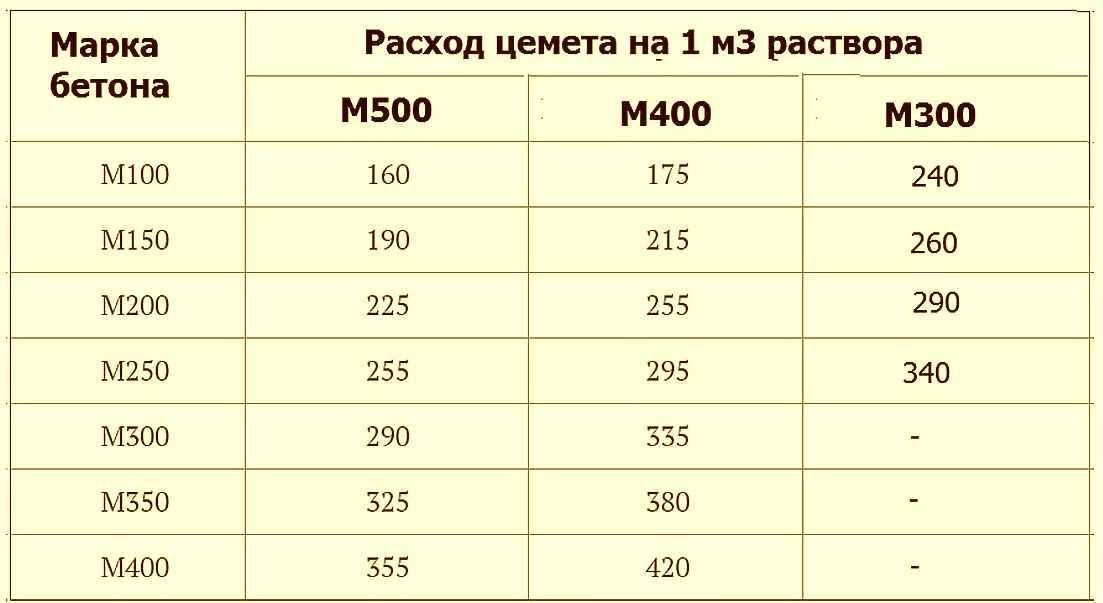 Таблица расхода цемента М400, М500 и М300 на 1 куб бетона разных марок