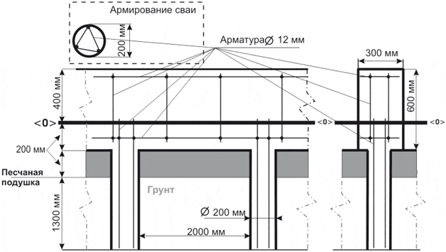 Важным технологическим моментом является армирование сваи, которое должно выходить за точку опоры с ростверкос на 30-40 см (для максимальной привязки).