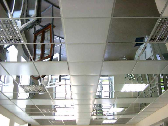 Фото: стеклянный потолок- Ламинированная фанера. Использование такого материала не уступает по эстетичности стеклянному потолку. Такой тип армстронга достаточно устойчив к влаге.