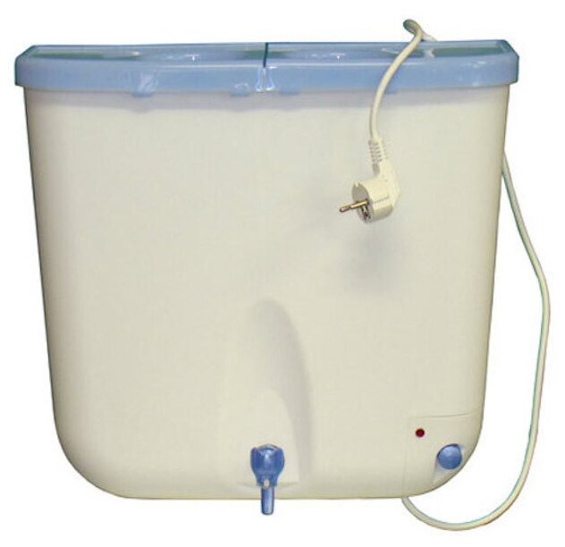 Водонагреватель состоит из пластмассового корпуса, нагревательного элемента с терморегулятором и душевого рассекателя с краном. В верхней части корпуса установлены два штуцера для залива/перелива воды.