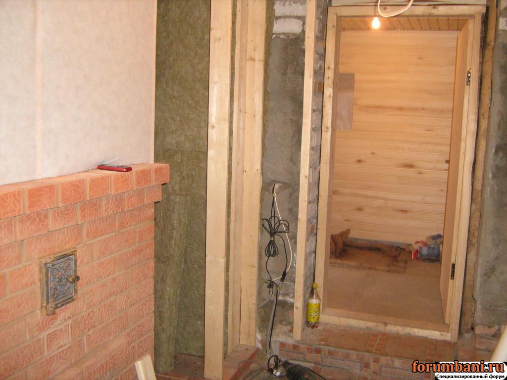 Первым шагом станет перепланировка помещения. Любая баня имеет как минимум 2 отделения: предбанник и парную. Иногда, если позволяет место, делают отдельный закуток с душем – помывочную. Для перепланировки достаточно выстроить перегородку между будущим предбанником и парной с дверным проемом. В качестве строительного материала хорошо подходит красный кирпич (б/у). Впрочем, возможны и другие варианты. Кроме перегородки в самой парной можно сделать небольшое окно, вырезав в стене проем. Вместо оконной рамы можно просто заложить проем стеклоблоками.