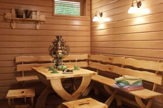 - грубоватые лавочки и большой стол из дерева в предбаннике;