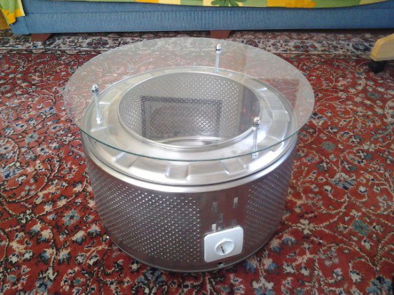 Ваша старая стиральная машина автомат, а точнее ее барабан поможет украсить внутреннее убранство квартиры. Из него можно соорудить оригинальный журнальный столик. Перфорированная нержавеющая сталь, дополненная цветной подсветкой, выглядит великолепно.
