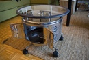 Изготовить такой необычный предмет мебели в стиле хай-тек несложно. Потребуется несколько стальных стержней, которые нужно прикрепить к барабану стиралки. На них фиксируется круглая столешница из стекла или плиты МДФ.