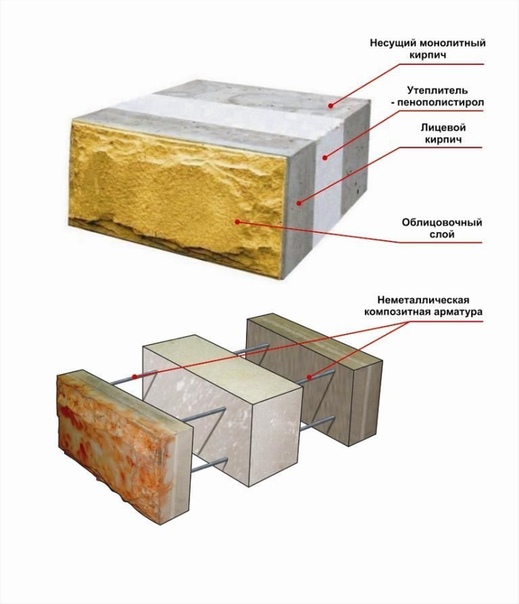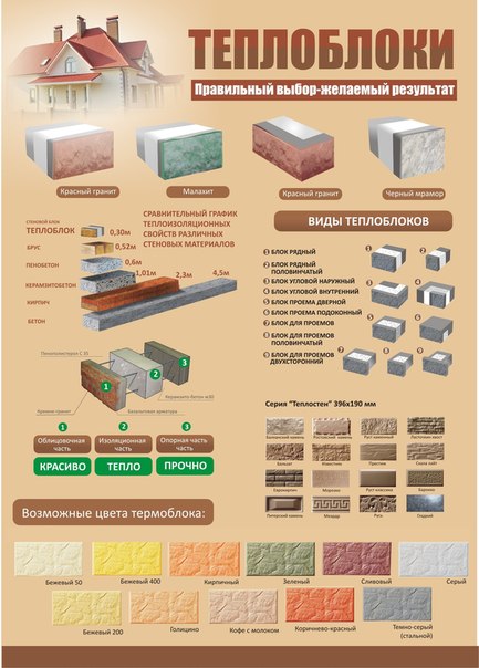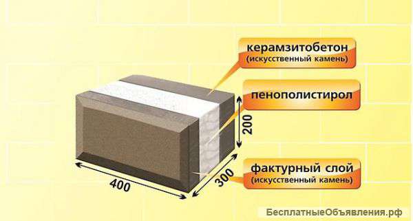 Такие блоки, известные как «Термоблок» или «Теплостен», имеют несколько слоев — основу из керамзитобетона или газобетона плотностью не менее 1000 кг/м3, утепляющую прослойку из пенополистирола и защитно-декоративный лицевой слой из бетона плотностью не менее 2400 кг/м3.