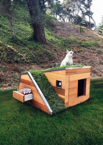 Многие питомцы обожают сидеть на крыше своего жилища, поэтому было бы неплохо разработать для него лежанку именно там. В этом случае крышу делают односкатной и практически прямой, без уклона. Если большие животные сами могут запрыгивать наверх, то для маленьких придется построить лесенку.