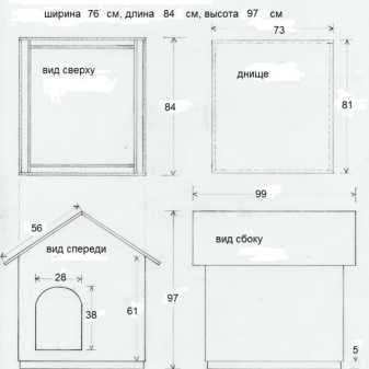 Прежде чем как построить конуру, нужно представить ее чертеж! Не обязательно составлять специальный чертеж для будки, так как конструкция не сложная. Можно просто нарисовать схему на простом листе бумаги и определить на ней размеры сооружения.