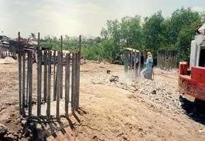 - В свежий бетонный раствор вибровдавливателем помещается каркас из прутьев армации.