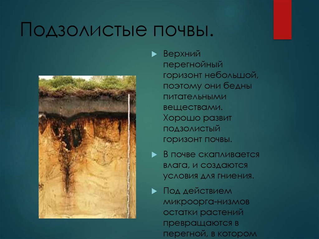 Подзолистые почвы еще и отличаются увеличенной кислотностью.