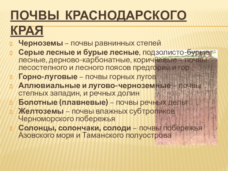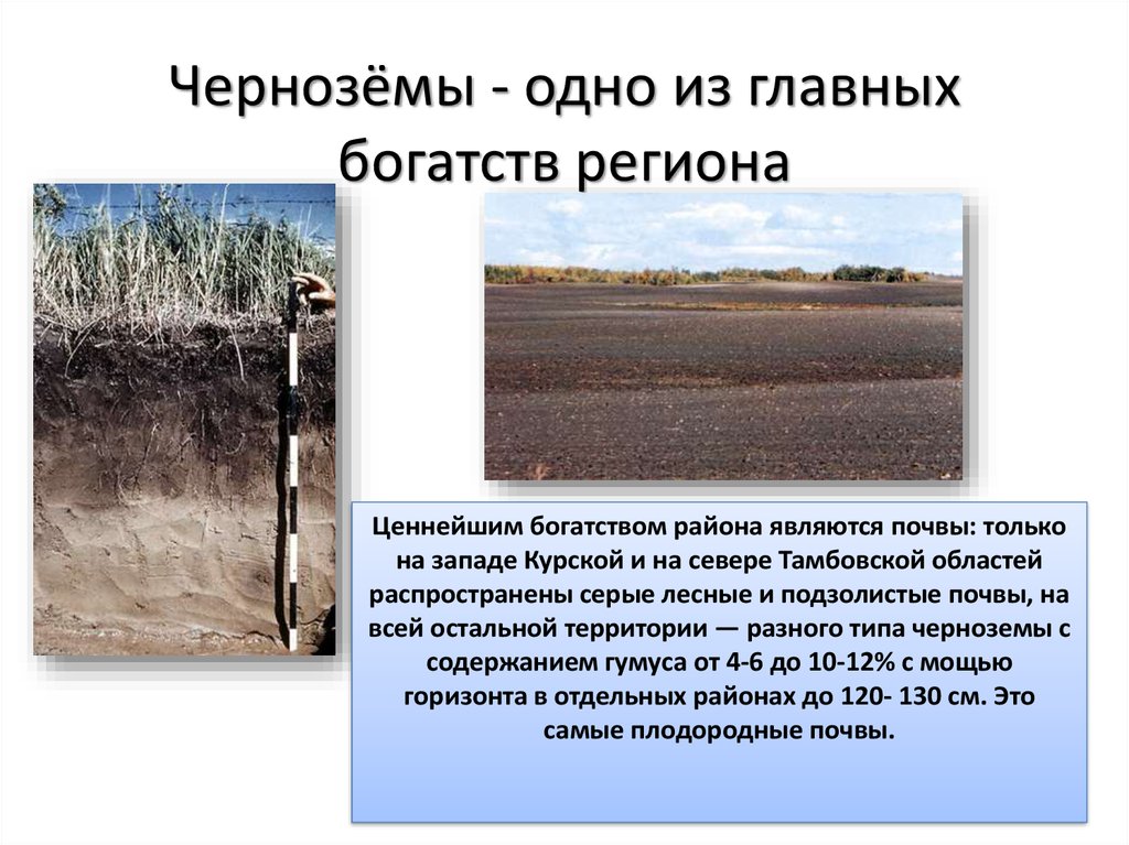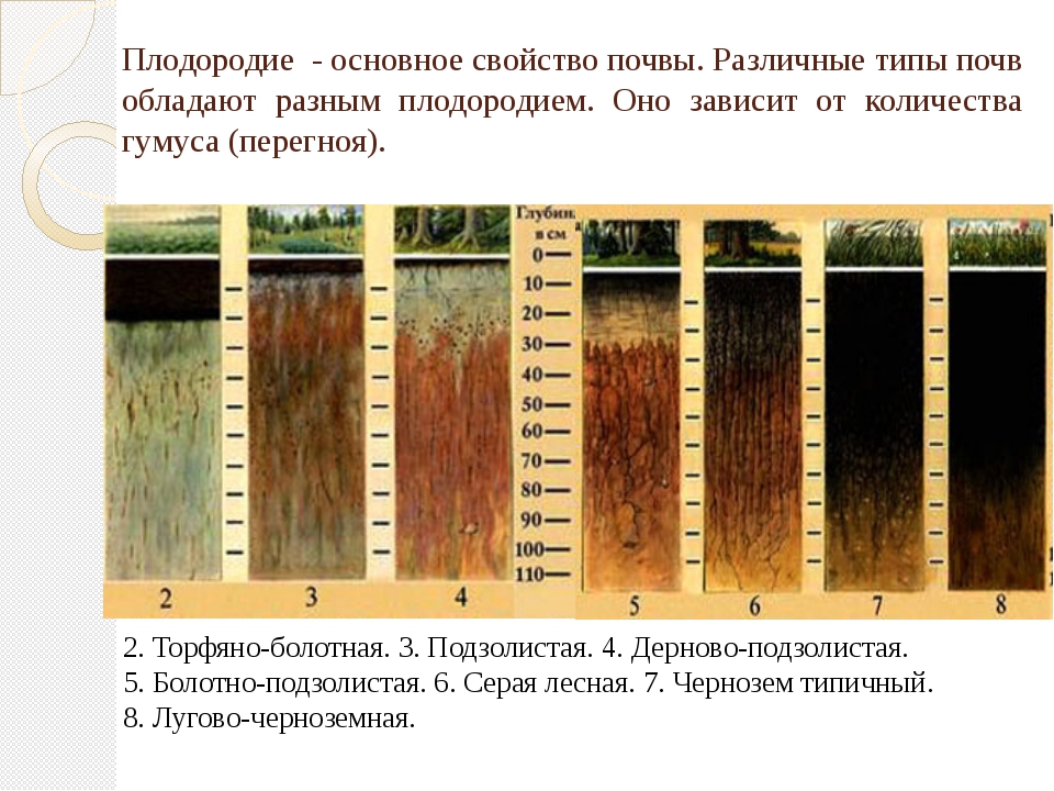 В зоне степей – почвы чернозёмные. На болотах – болотные. На лугах – луговые почвы. Главное свойство почвы — это плодородие. Из всех типов почв самая плодородная – это чернозёмная почва, или как её ещё называют – чернозём. Вслушайтесь в название «чернозём». Слово образовалось от двух слов – чёрная и земля. Дело в том, что чернозёмные почвы очень тёмного, чёрного цвета. А всё потому, что чернозём отличается от других почв богатством содержания перегноя. Перегной – это разложившиеся остатки растений и животных. И из-за большого содержания перегноя, почвы такого тёмного цвета. Если посадить в такую почву семена, то при правильном уходе получается хороший урожай.