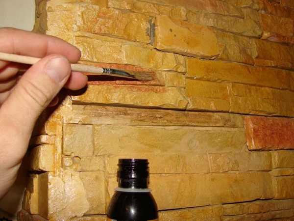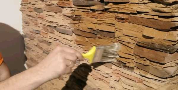Использование кисти приводит к тому, что камень прокрашивается неровно. Какой бы качественной кисточка ни была, потеков и разводов не избежать все равно. Зато она незаменима для нанесения лака на рваные участки облицовки. Можно не торопясь обрабатывать каждый камешек, наводить или, наоборот, ослаблять полутона, украсить его прожилками, характерными для натурального камня. Технология самая простая: обмакивать кисть в выбранный состав и красить.