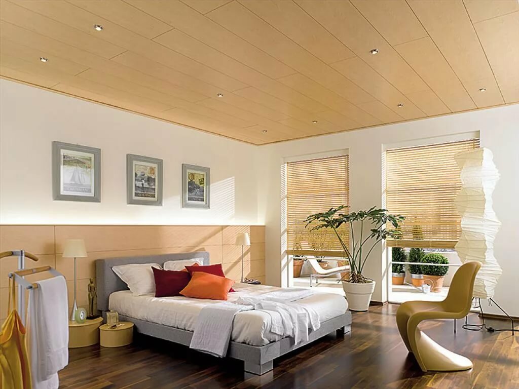 В данном случае придётся отказаться от панелей ПВХ, дорогих фирменных подвесных систем. Искусственный поливинилхлорид в отделке помещения из натурального материала будет резко диссонировать, а подвесные системы реечных, зеркальных и стеклянных потолков – это, всё же, урбанистический дизайн.