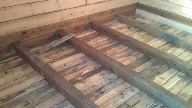 Если старый деревянный пол сгнил или вы решили заменить его по каким-то причинам, снимите чистовой пол и покрытие чернового пола, это позволит оценить состояние лаг и стен. Если старые лаги повреждены, полностью уберите их, срезав вровень со стеной. Осмотрите венец, в который были врезаны лаги, возможно, его придется отремонтировать или заменить. Если венец в порядке, обработайте его шлифмашинкой и покройте защитными составами. Также обработайте защитными составами лаги и доски настила.