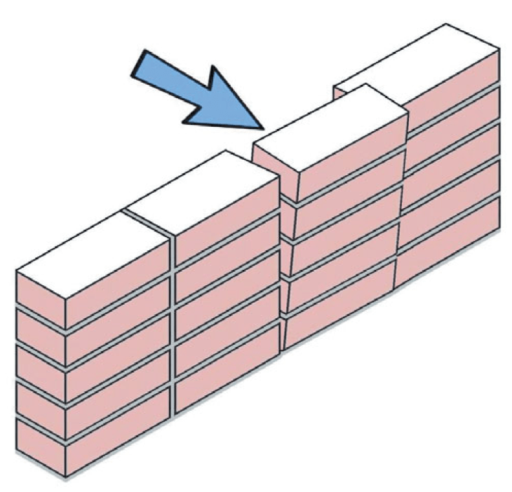 Кирпич, поставленный на ребро, гораздо менее устойчив, так как его толщина всего шесть сантиметров. Свежая кладка может запросто деформироваться под собственной тяжестью. Поэтому такую перегородку поднимают в несколько приемов, давая подсохнуть выложенным ранее рядам и набрать некоторую прочность. Обычно такую перегородку выкладывают за два – три подхода.