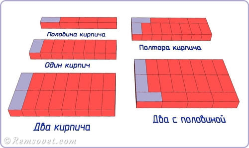 Термин: «в половину кирпича» означает, что кирпич укладывается вдоль плоскости перегородки, таким образом ширина перегородки составляет ~ 120 мм. Термин: «в четверть кирпича» означает, что кирпич укладывается вдоль на ребро, таким образом ширина перегородки составляет 65-88 мм.