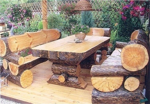 Добротную и долговечную садовую мебель часто делают из цельных «остатков» дерева. Если диаметр бревна позволяет, можно смело делать стол. Прикручиваем к нему колесики, и получаем мобильный вариант.