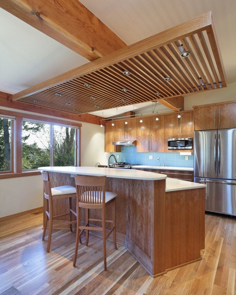 - При выборе материала для кухни также учитывают, что он должен выдерживать высокую влажность и легко очищаться. Здесь уместно будут смотреться натяжные потолки из пленки. В кухню нередко выбирают подвесные конструкции из пластиковых панелей. К их преимуществам относят то, что они гораздо легче очищаются, чем другие материалы. В кухне и ванной могут устанавливаться гиспокартонные конструкции, при этом следует выбирать листы, относящиеся к влагоустойчивому классу. Их рекомендуется покрыть специальной водно-дисперсионной краской.
