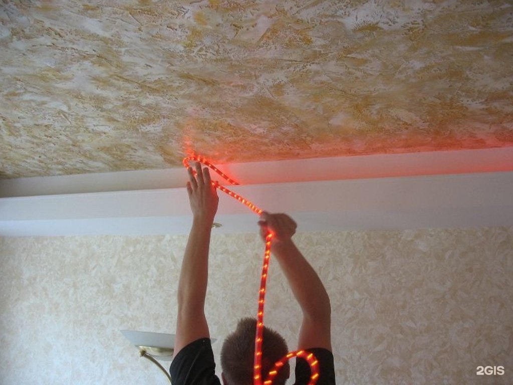 Поэтому места для установки осветительных приборов продумываются заранее. Оптимальным вариантом считаются светодиодные лампы, которые не нагревают пленку или ткань, исключая ее деформацию. - С окрашенными, побеленными или оклеенными обоями потолками удачно сочетается люстра. Встраиваемые светильники в данном случае проблемно монтировать, поэтому от них лучше отказаться.
