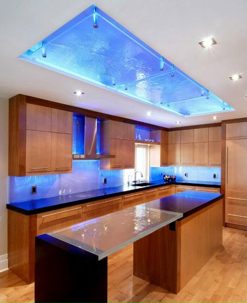 - С подвесными гипсокартонными потолками можно устанавливать люстры и светильники различных размеров на крюк или анкерные крепления. В конструкцию устанавливаются точечные светильники, но их размещение необходимо продумать заранее, до начала ремонтных работ. Также можно сделать подсветку с помощью светодиодной ленты. В многоуровневых конструкциях часто используется несколько вариантов освещения.