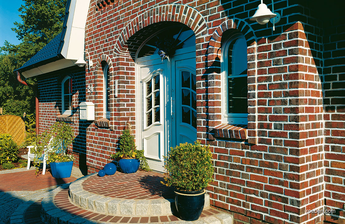 Баварская кладка может проводиться, буквально, «на глаз»: мастер просто чередует кирпич разных оттенков в ряду — красный, коричневый, бежевый, песочный и опять красный, коричневый… Или же, по строгой, заранее составленной схеме, которая призвана выделить, например, углы дома, цоколь, фасад вокруг окна.