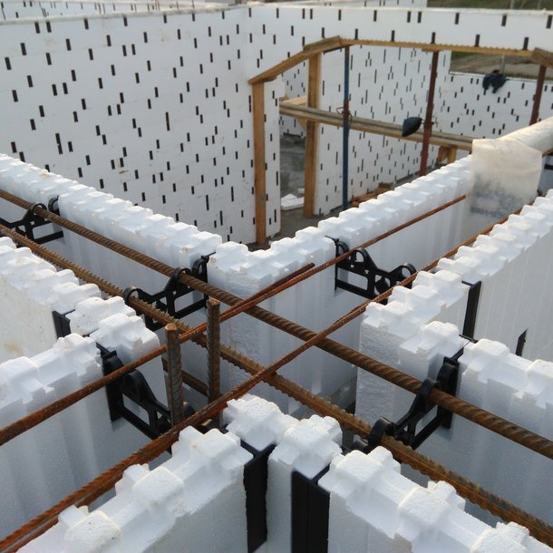 - блок состоит из двух пластин, соединенных перемычками из стали или пластика. Внутри блока монтируется арматура и устанавливается дополнительный слой утеплителя;