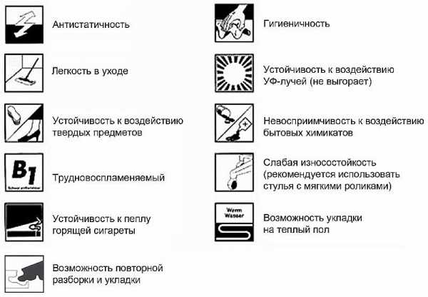 Иногда на упаковку помещают значки, которые тоже дают информацию о продукте. Это удобно: характеристики наглядны, и понять, подходит ли покрытие, проще.