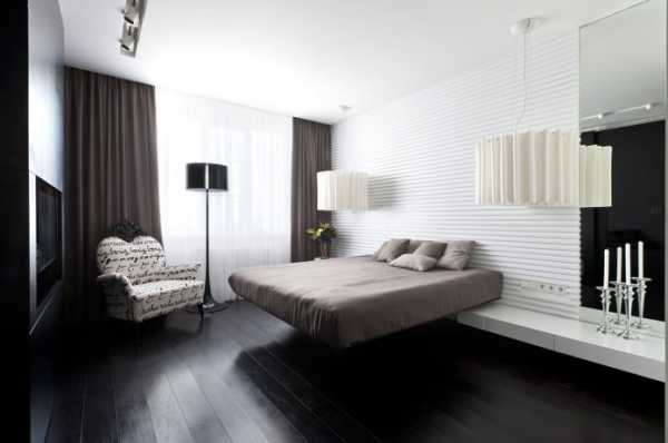 - Присутствие одного из двух элементов пола тёмно-коричневого цвета при правильном подборе второго оттенка является прекрасным дополнением интерьера в любой цветовой гамме. При использовании комбинации этого цвета пола в белой спальне, второй цвет должен соответствовать интерьеру комнаты. Если в основных элементах убранства присутствует лаковый блеск или глянец, лучше выбрать чисто белый материал. Спальня в матовых тонах будет казаться более тёплой, если второй элемент пола будет иметь оттенок сливок, слоновой кости или топлёного молока.