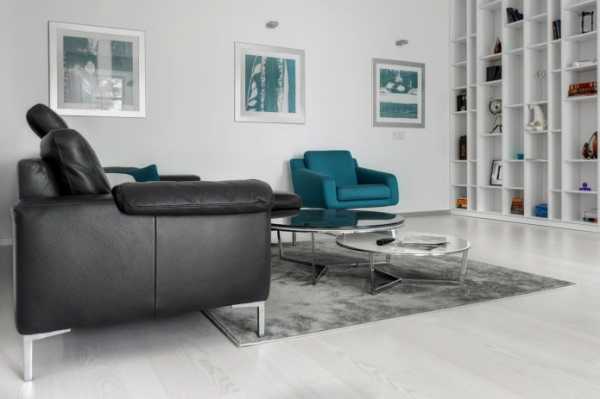 - Неплохо серый оттенок в покрытии пола сочетается с более светлым почти белым тоном. Но здесь цвет пола диктует некоторые ограничения в выборе цвета мебели и обоев для стен.