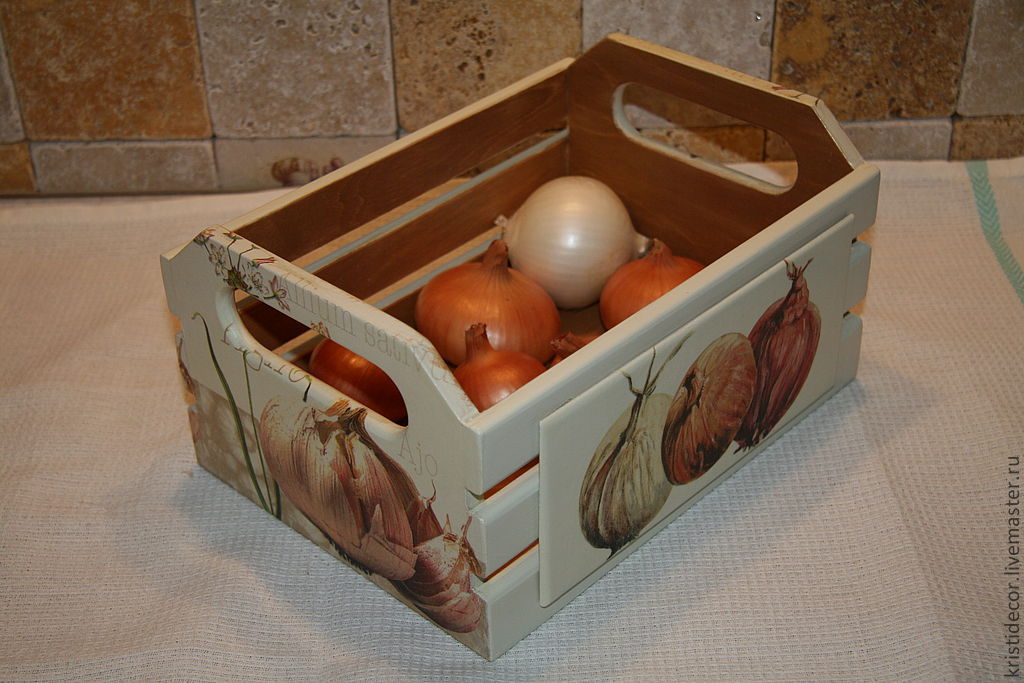 Ящики, закрепленные на специальных ножках с промежутками между модулями, станут отличным дополнением кухни в деревенском стиле. В них хранят овощи (картофель, лук, морковь), банки с соленьями или консервы. Важно, чтобы каждый ящичек закреплялся в естественном положении, то есть днищем вниз. Таким образом, прочность шкафчика повысится, ведь тара изначально и была рассчитана на большие нагрузки.
