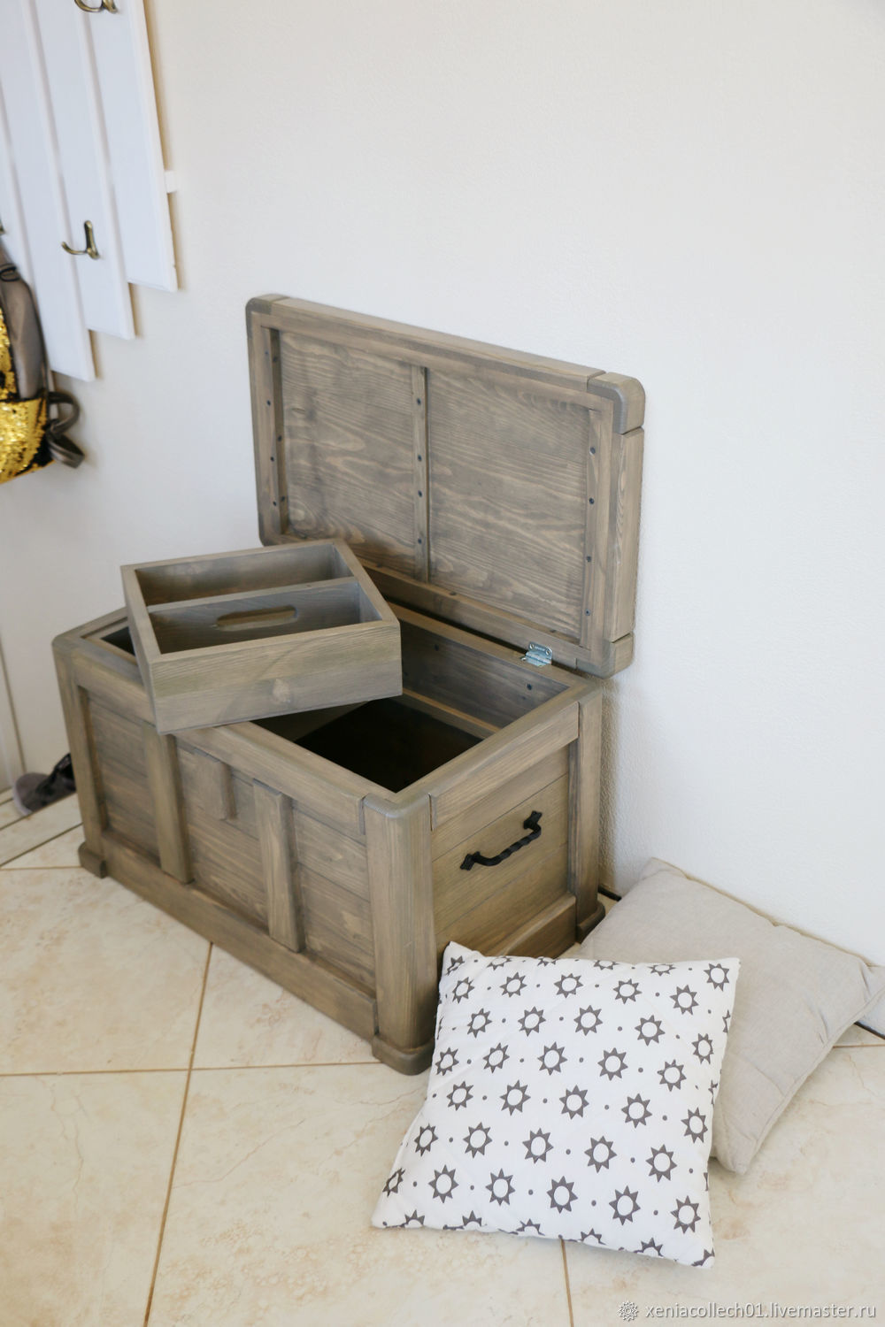 Такая полка может использоваться одновременно и как скамья. Достаточно соединить 3 ящика, поставить их на ножки и присоединить столешницу. А цвет выбирайте по своему вкусу и желанию.