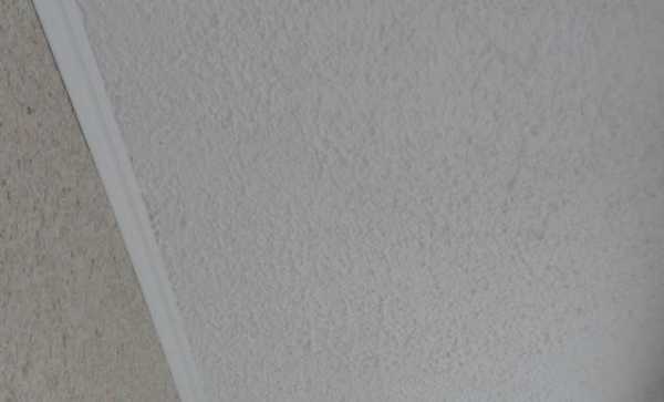 - Если поверхность потолка достаточно ровная, незначительные огрехи вполне можно скрыть под текстурной краской. Вам понадобится только зашпаклевать трещины на стыках плит перекрытия. Но между плитами нередко бывают перепады по высоте, а это уже требует выравнивания. В любом случае, на идеально ровной поверхности рисунок будет смотреться лучше.