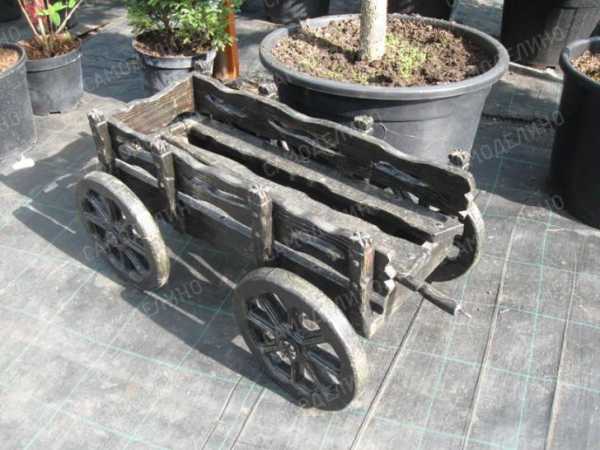 Таким же способом можно собрать своими руками повозку на четырех колесах. В ней легко уместится три вазона с цветами. Цвет морилки может быть разный и определяется обстановкой, в которой будет находиться поделка.