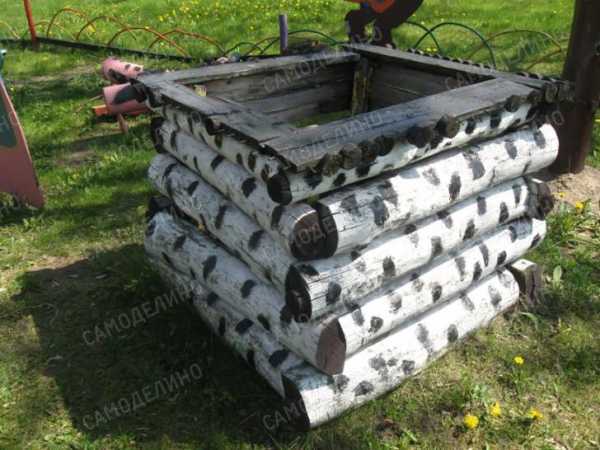 - Выдолбленные бревна, засаженные цветами, горшки для цветов из небольших отрезков брёвен