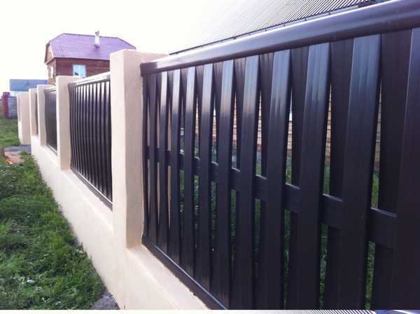 По такому ограждению забраться наверх сложнее. Обратите внимание, что сверху есть защитный козырек. Он защищает самую уязвимую часть ограды, намного продлевая срок его эксплуатации, а также отодвигая время следующей покраски. Ведь обычно вверху и внизу покрытие самое поврежденное. Снизу этот забор защищен цоколем, сверху — козырьком.