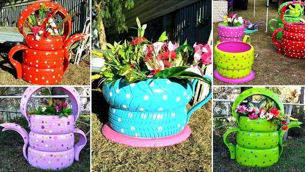 Из покрышек вырезают форму для клумбы, окрашивают их и сажают растения. Несколько сделанных клумб-покрышек украсят садовый участок.