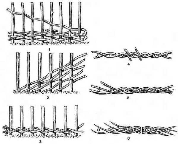Вплетают тонкие прутья в шахматном порядке. Ветвь ивы сначала заводят за толстый прут, а затем перед ним. Это делается для более надежной фиксации. Для закрепления крайних ветвей используется проволока.
