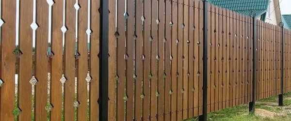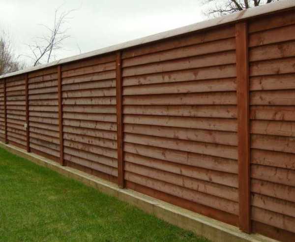 Этот тип забора очень неэкономичный — расход древесины обычно большой. Сложна и сборка: под каждую доску крепить брусок (уголок) или запиливать в столбе выемку.